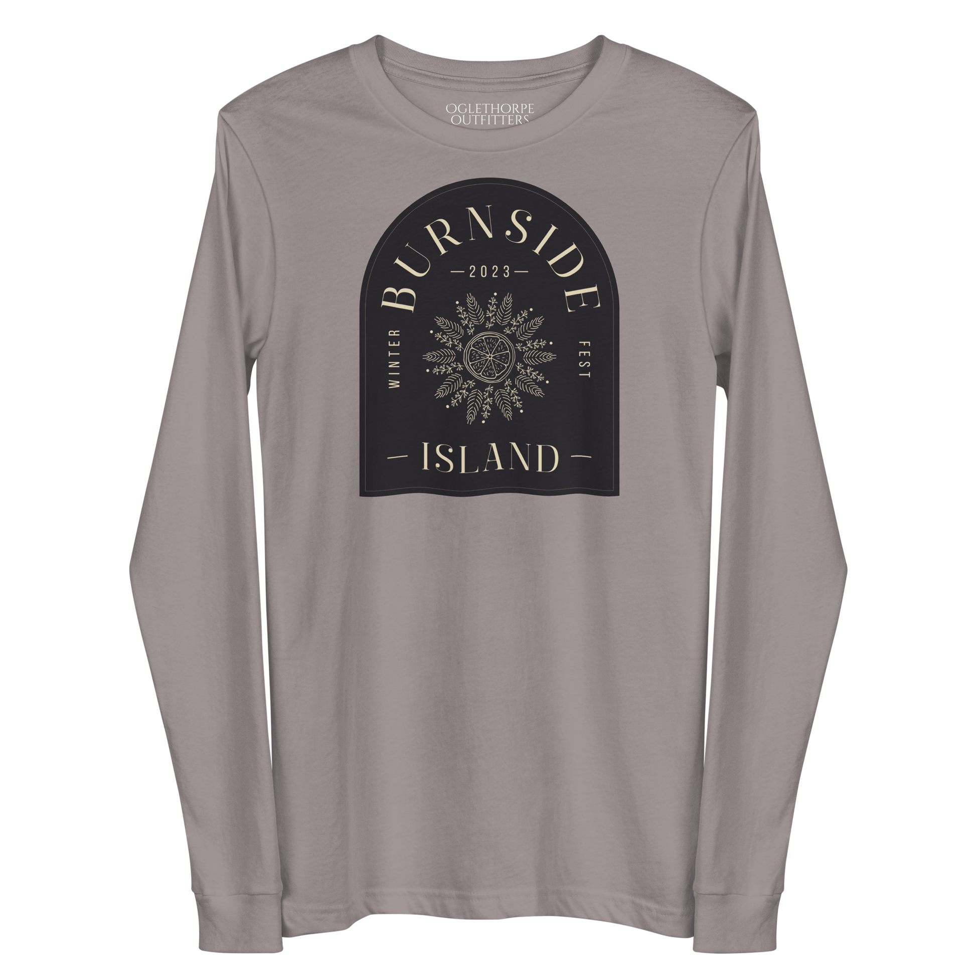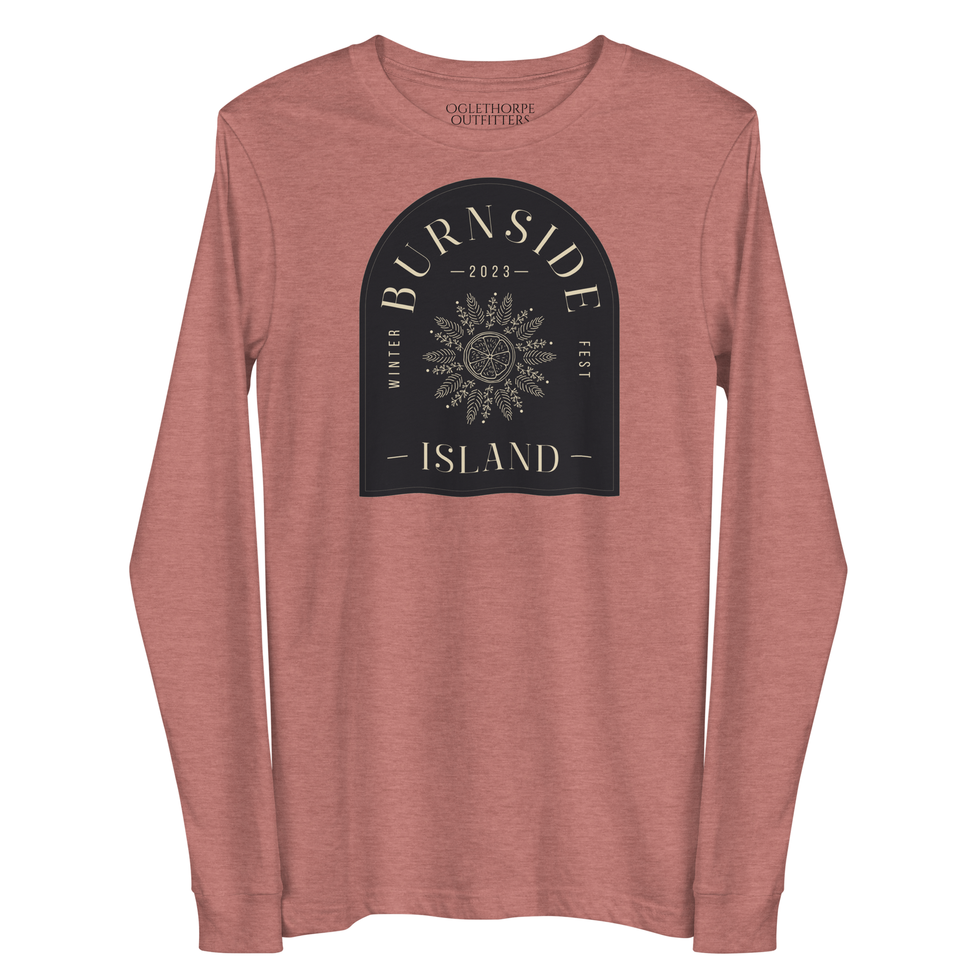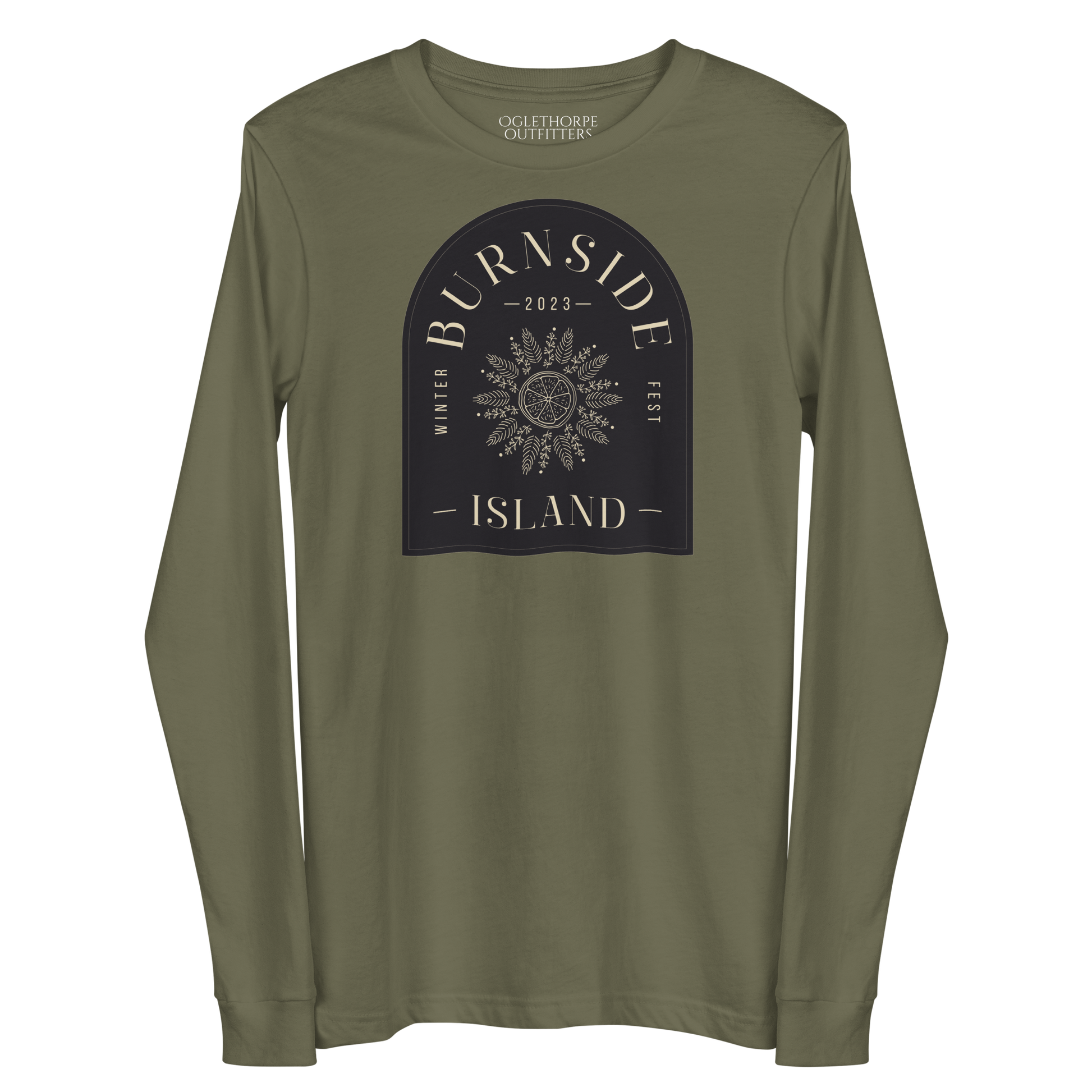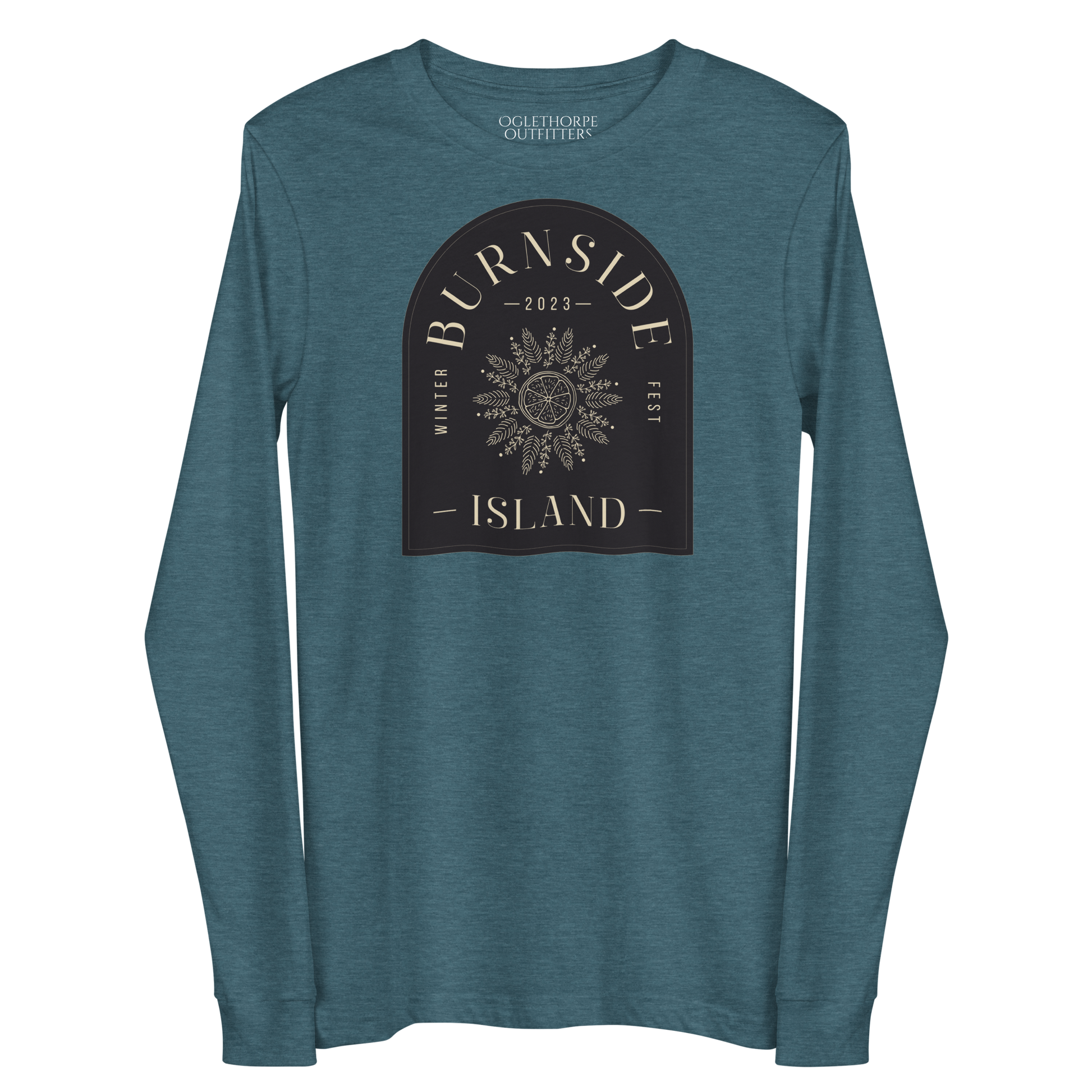 Enjoy the comfortably-cool Coastal Georgia winter in our Burnside Island Winterfest 2023 Citrus & Pine Long-Sleeve T-Shirt – a refreshing twist on holiday style that perfectly captures the coastal spirit of Georgia's winter celebrations. This unique shirt features a delightful snowflake crafted from pine branches, a slice of citrus, and a touch of mistletoe, creating a harmonious blend of coastal elements and festive cheer.
